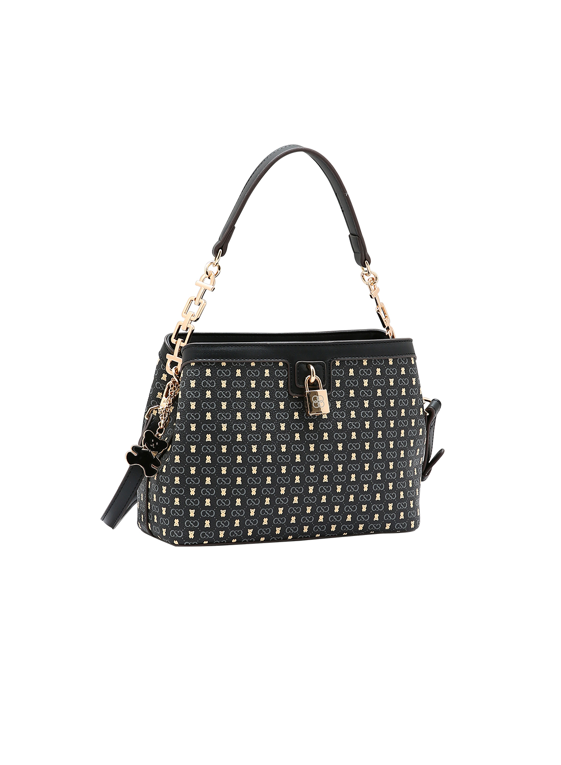 Essa bolsa tem um estilo elegante com inspiração clássica, mas traz detalhes modernos que a tornam sofisticada e cheia de personalidade. Possui 2 alças: de mão para um estilo mais clássico, e transversal para mais praticidade. Vem com duas divisórias, e bolsos para pequenos objetos, fechamento com zíper. O detalhe decorativo do cadeado e o chaveiro de ursinho complementam com sofisticação de delicadeza.
