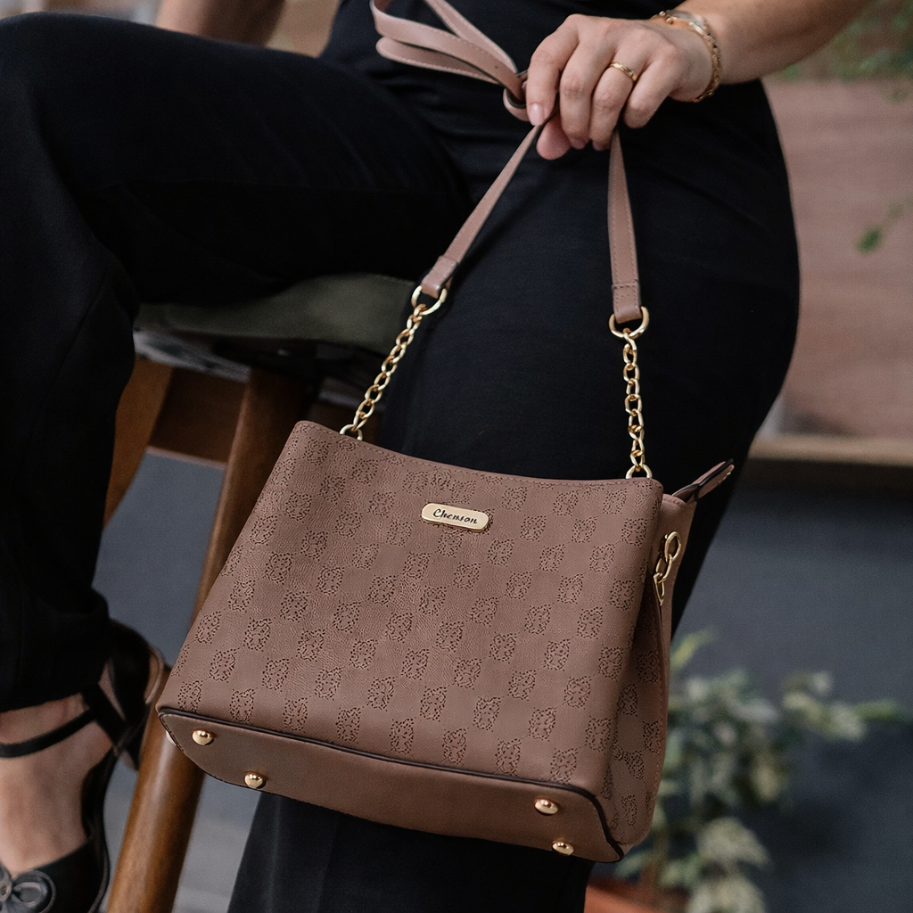 Bolsa feminina média Chenson com design delicado e estampa perfurada. Produzida em material impermeável, oferece ótima organização com três divisórias, alça transversal regulável com detalhes em corrente e bolsos internos funcionais para o dia a dia.