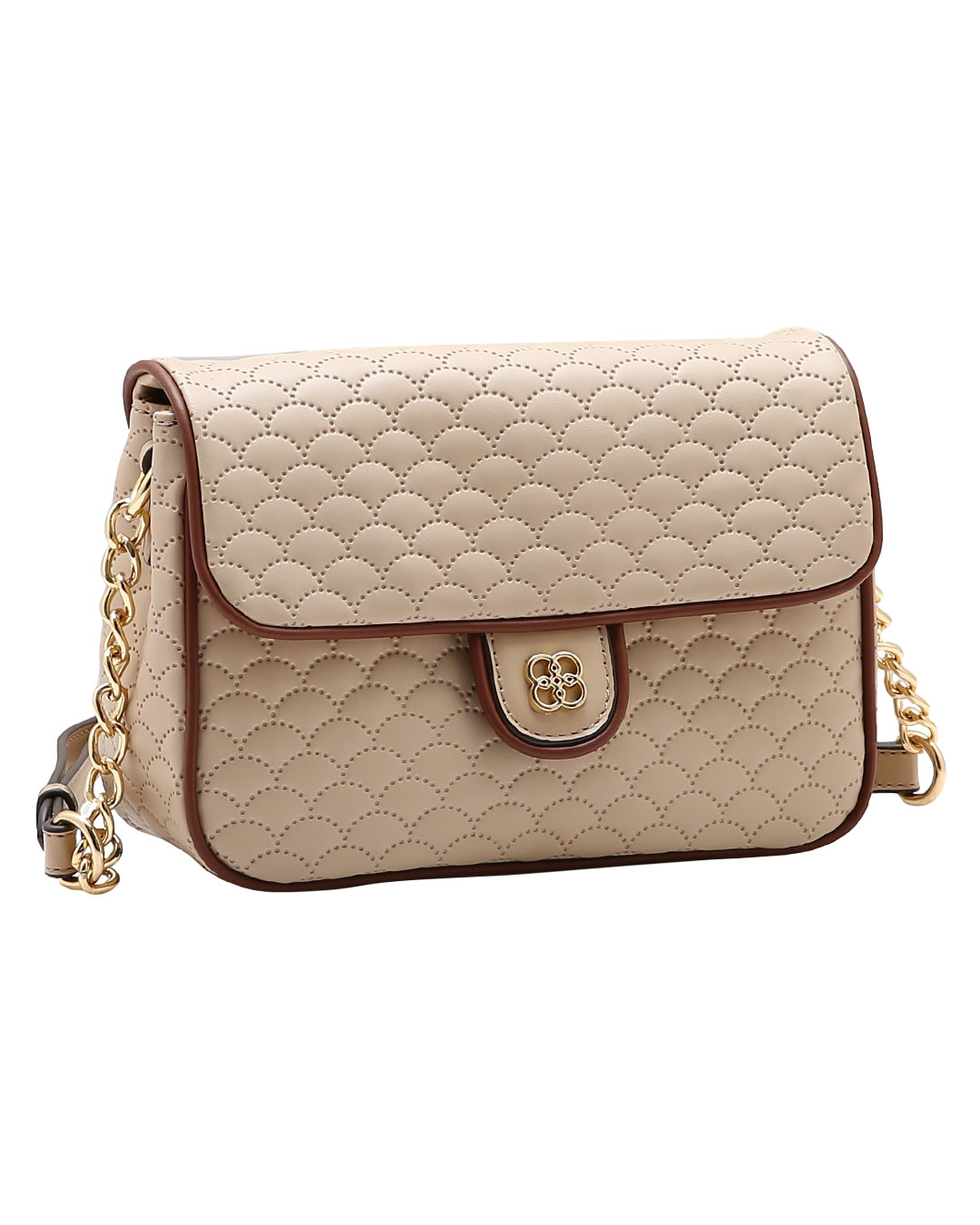 Aba curta, fecho frontal delicado, acabamentos refinados e ferragens douradas que fazem a diferença.