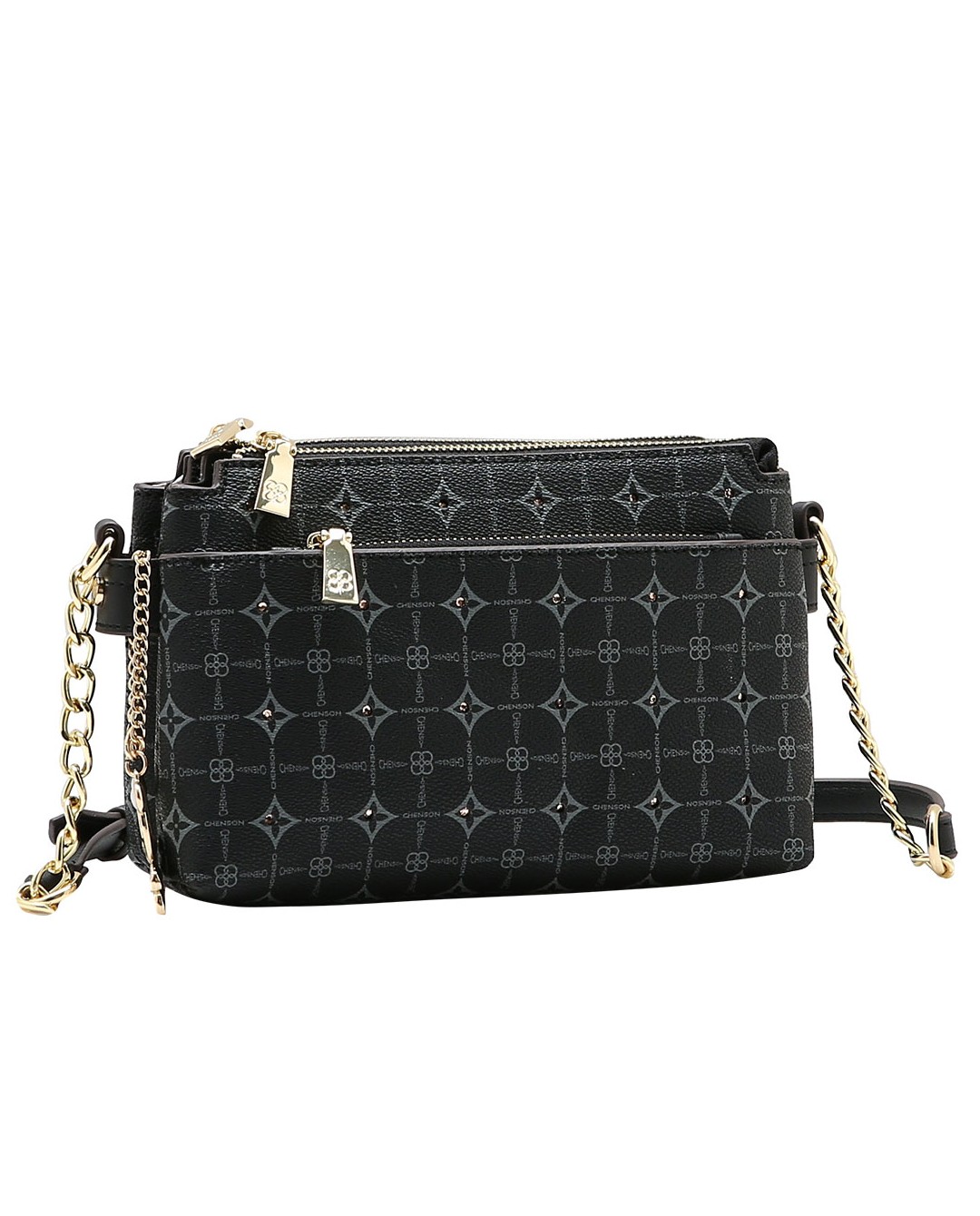 Bolsa crossbody feminina Chenson com estampa monograma delicada, aplicação de cristais de zircônia e alça transversal com detalhes em correntes. Modelo compacto, sofisticado e funcional.